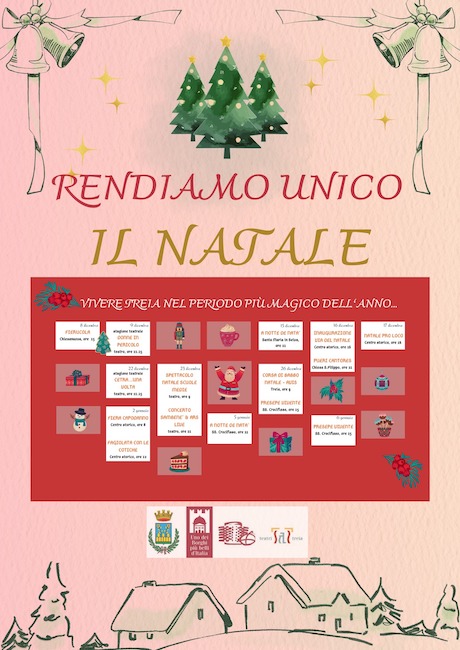 Santissimo Crocifisso). Sabato 16 dicembre alle ore 16 tutti all’inaugurazione della “Via del Natale”, organizzato dalle scuole e l’Anteas, poi alle ore 21 nella chiesa di San Filippo si svolgerà il concerto dei Pueri Cantores. La domenica alle 17 “Il Natale della pro Loco” nel centro storico, per rendere ancora più unico ogni momento. Il 23 dicembre a teatro tocca al concerto dei Sambenè e Ars Live. Il giorno di Santo Stefano alle 9 si parte dal centro storico per la Corsa di Babbo Natale dell’Avis, nel pomeriggio torna la tradizione del presepe vivente al SS.Crocifisso. L’anno nuovo inizierà il 2 gennaio con la Fiera di Capodanno e la fagiolata con le cotiche per tutti. Si chiude il 6 gennaio col presepe vivente che questa volta vedrà anche l’arrivo dei Magi.
