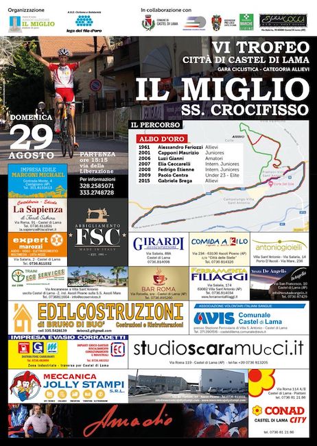 CASTEL DI LAMA (AP) – Si svolgerà domani, 29 agosto 2021 il Trofeo Città di Castel di Lama-Il Miglio SS Crocifisso per allievi che l’Associazione il Miglio e l’Asd Ciclismo e Solidarietà – Lega del Filo d’Oro terranno a battesimo per la sesta volta.