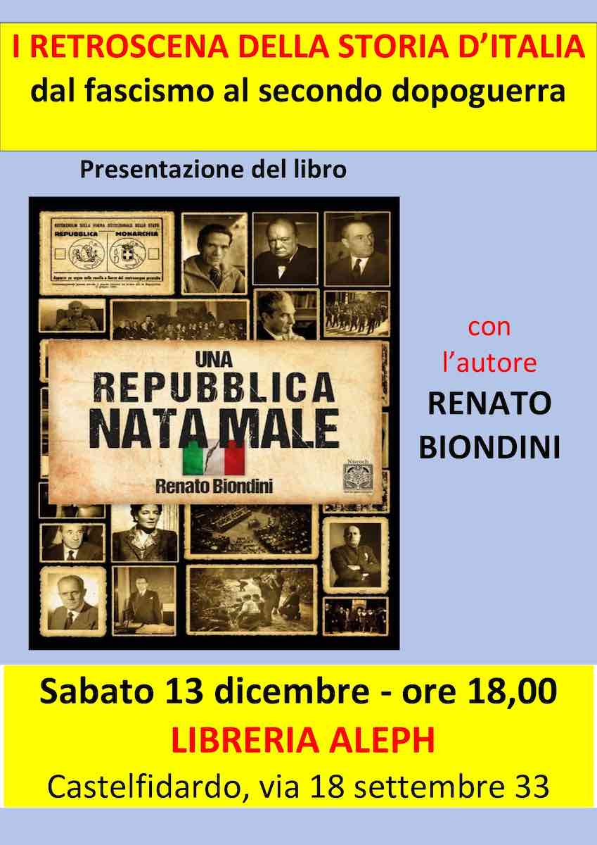 CASTELFIDARDO – I retroscena della storia d’Italia dal fascismo al secondo dopoguerra; è questo il titolo dell’incontro previsto sabato 13 dicembre ore 18 alla libreria Aleph di Castelfidardo, nel quale verrà ri-presentato uno straordinario libro-inchiesta: “Una Repubblica nata male. L’Italia dal fascismo al secondo dopoguerra” (Edizioni Nisroch) con l’autore Renato Biondini.