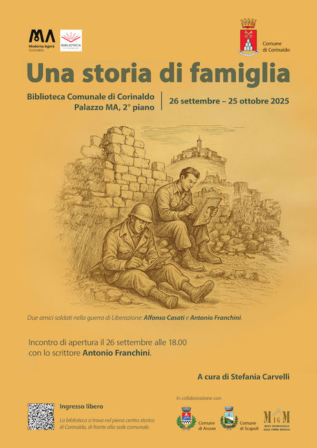 CORINALDO – Venerdì 26 settembre alle ore 18.00 si inaugura la mostra “Una Storia di Famiglia”. L’esposizione, allestita presso la Biblioteca Comunale di Corinaldo, è patrocinata dal Comune di Corinaldo in collaborazione con i comuni di Arcore (MB) e Scapoli (IS) e con il Museo Internazionale delle Guerre Mondiali di Rocchetta Nuova.
