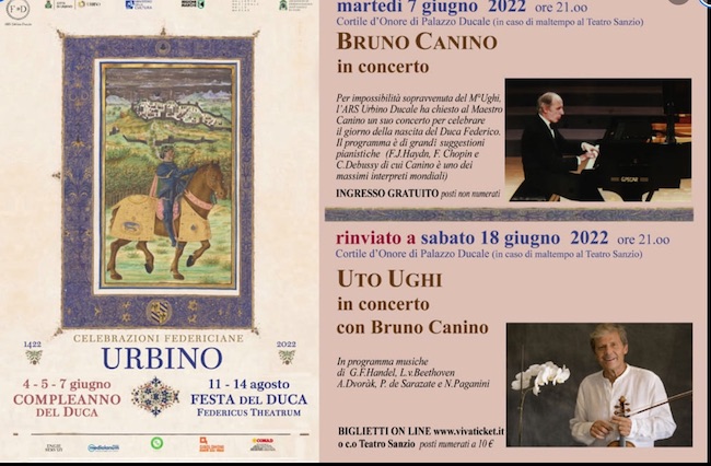 URBINO – Le celebrazioni del compleanno del Duca si svolgeranno ugualmente nel giorno del suo compleanno sebbene il concerto di Uto Ughi sia stato rinviato a sabato 18 giugno per sopraggiunte ragioni di salute (certificate dal suo medico). L’ARS Urbino Ducale, attraverso il suo direttore artistico, ha chiesto al Maestro BRUNO CANINO un suo concerto per oggi, martedì 7 giugno a Palazzo Ducale di Urbino, alle ore 21. L’ingresso sarà gratuito per il pubblico.