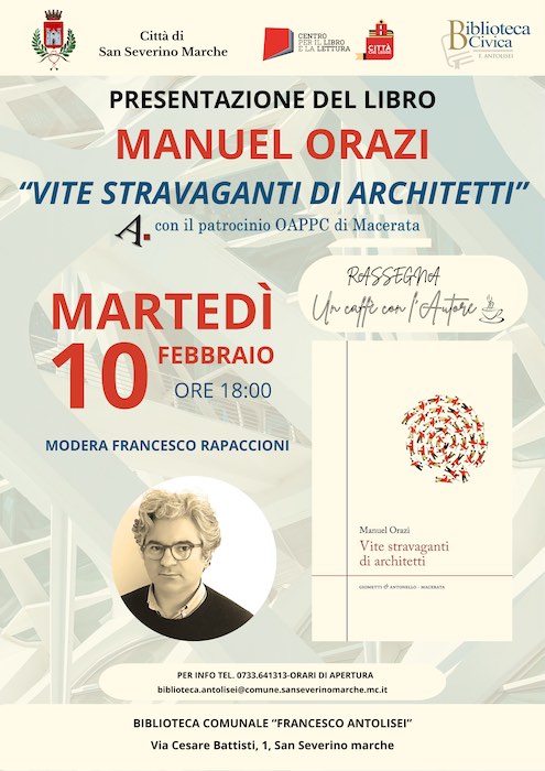 SAN SEVERINO MARCHE – Nuovo appuntamento con la rassegna letteraria “Un caffè con l’Autore” che oggi,martedì 10 febbraio, a partire dalle ore 18, accoglie negli spazi della biblioteca comunale “Francesco Antolisei” Città di San Severino Marche la presentazione dell’ultimo lavoro editoriale di Manuel Orazi: “Vite stravaganti di architetti”.