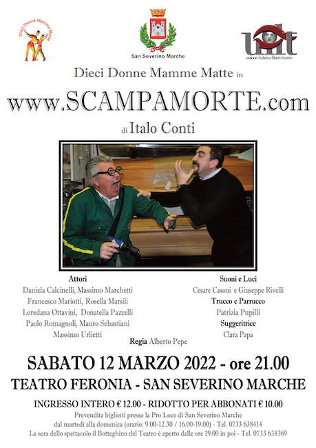 SAN SEVERINO MARCHE – Sabato 12 marzo 2022, alle ore 21.00, al Teatro Feronia di San Severino Marche andrà in scena “www.Scampamorte.com”, commedia in due atti di Italo Conti.